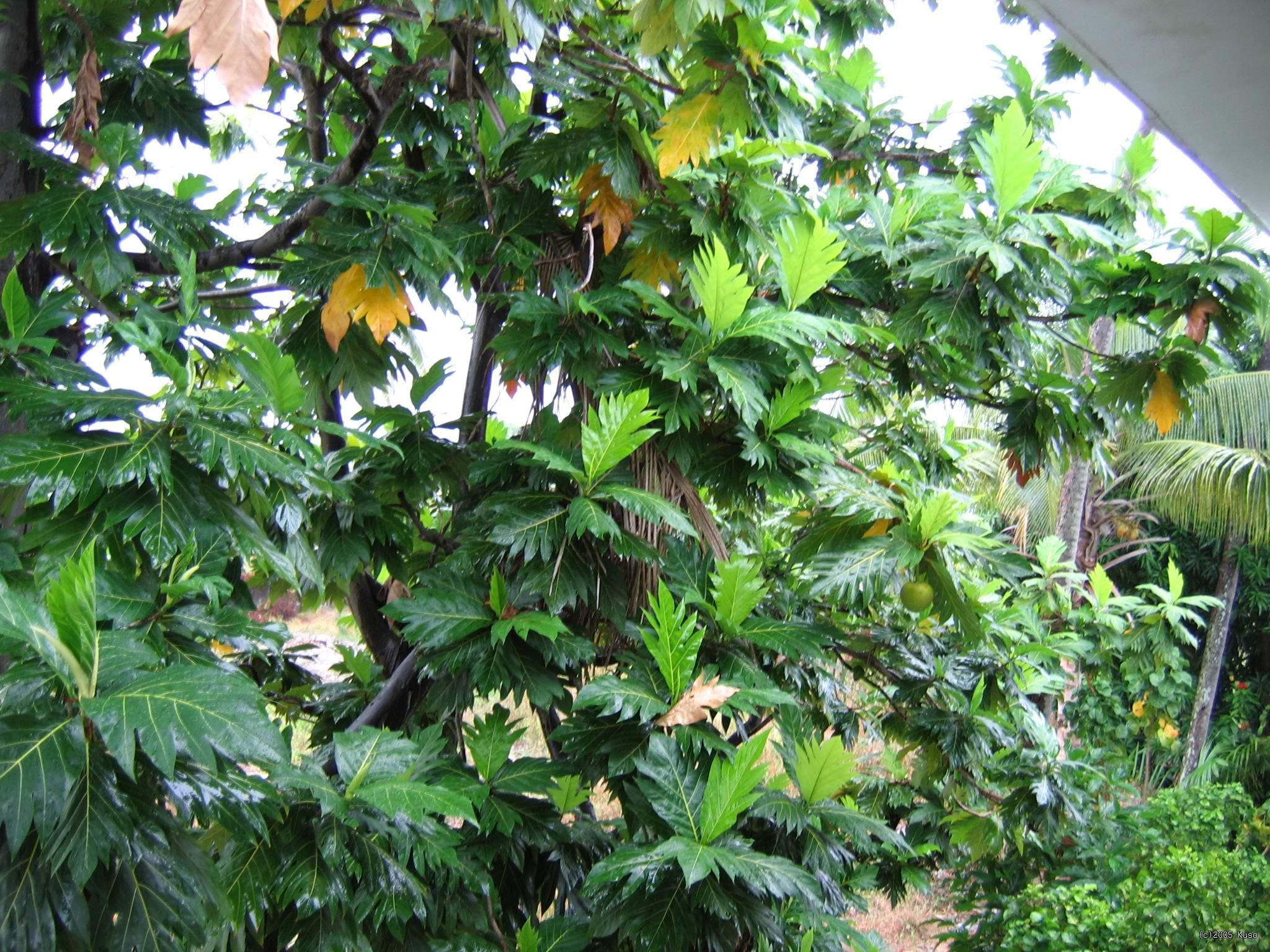 Fiji - Lautoka - chlebovník Autobusom sme sa presunuli do Lautoky vzdialenej asi 20 km od Nadi, kde sme prespali. Pred oknami hotela rástlo toto čudo s guľatými plodmi - chlebovník.