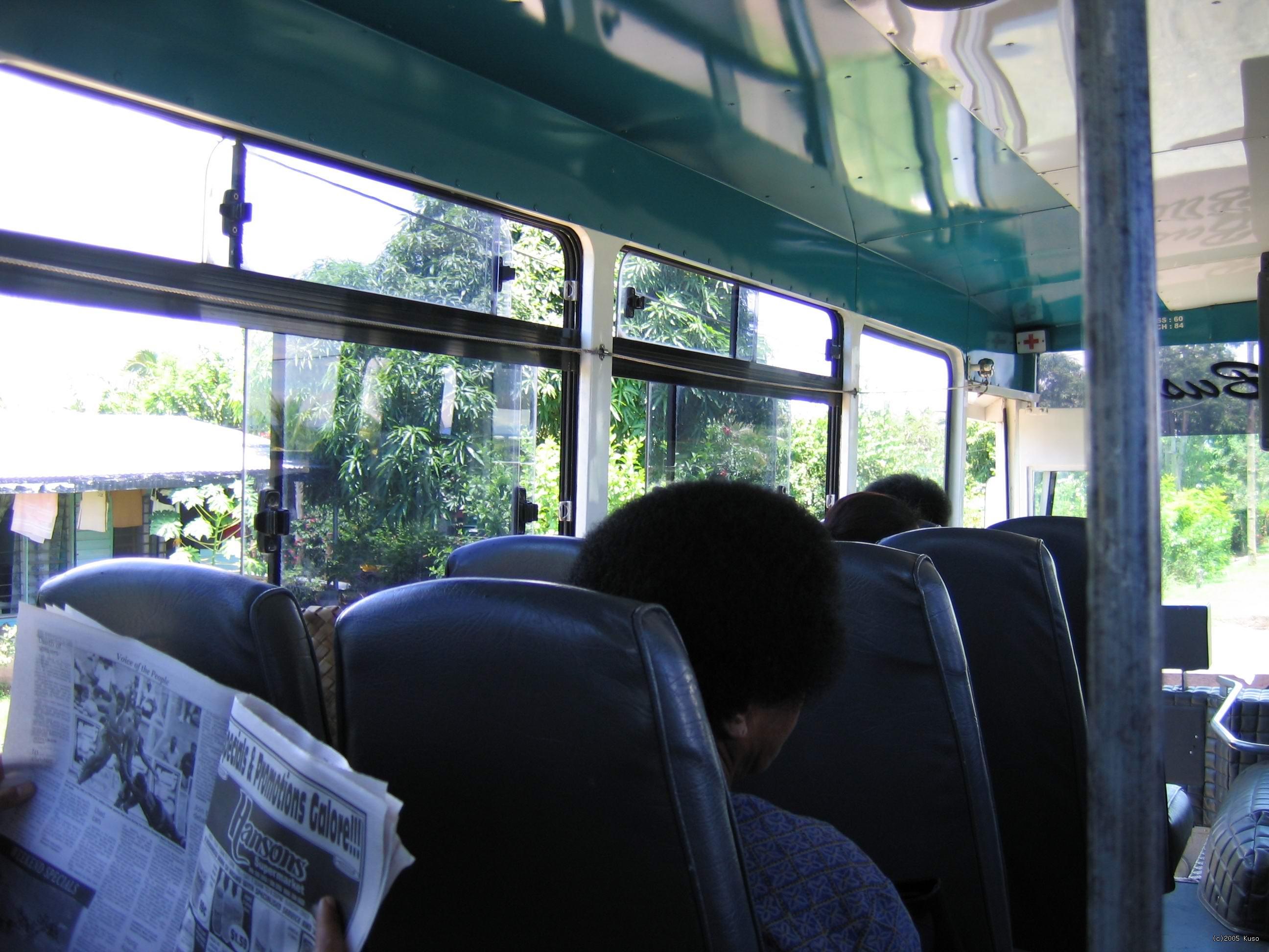 Fiji Návrat autobusom z Lautoky do Nadi. Kto chce zastaviť, potiahne špagát nad oknom a ten zazvoní na zvonček pri šoférovi. |