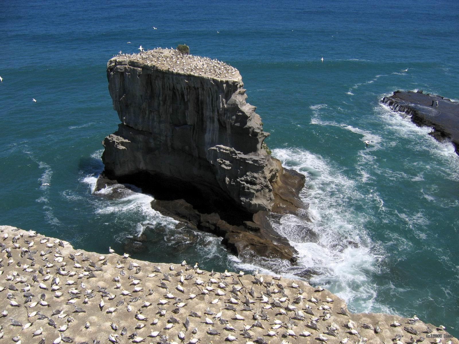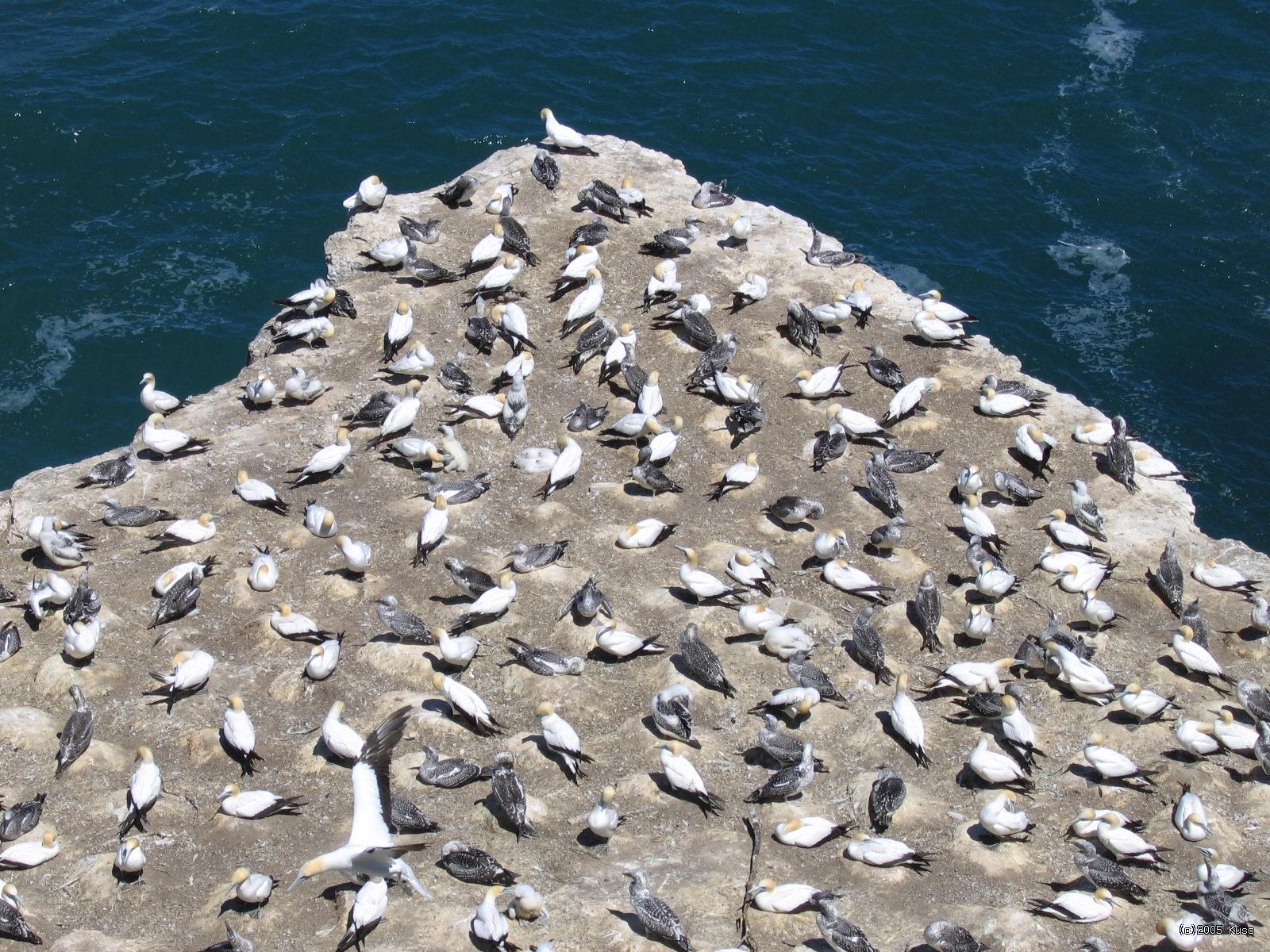 Kolónia Ganetov Ganety sú veľké morské vtáky, ktoré žijú v kolóniách, typicky na takýchto skalnatých útesoch pri mori. Sú výborní letci, ale majú problém so štartom, preto využívajú vysoké skaly, z ktorých sa vrhnú dolu, čo im umožní nabrať rýchlosť a tak si uľahčiť štart.