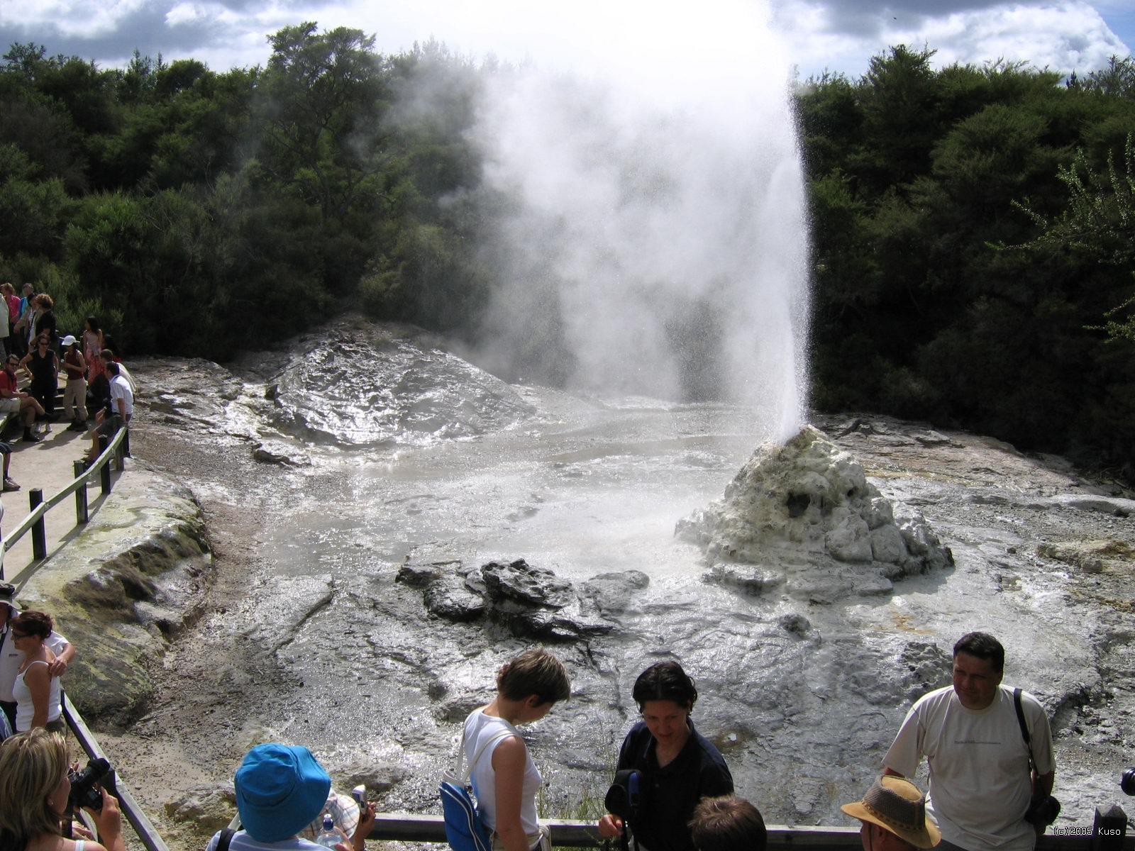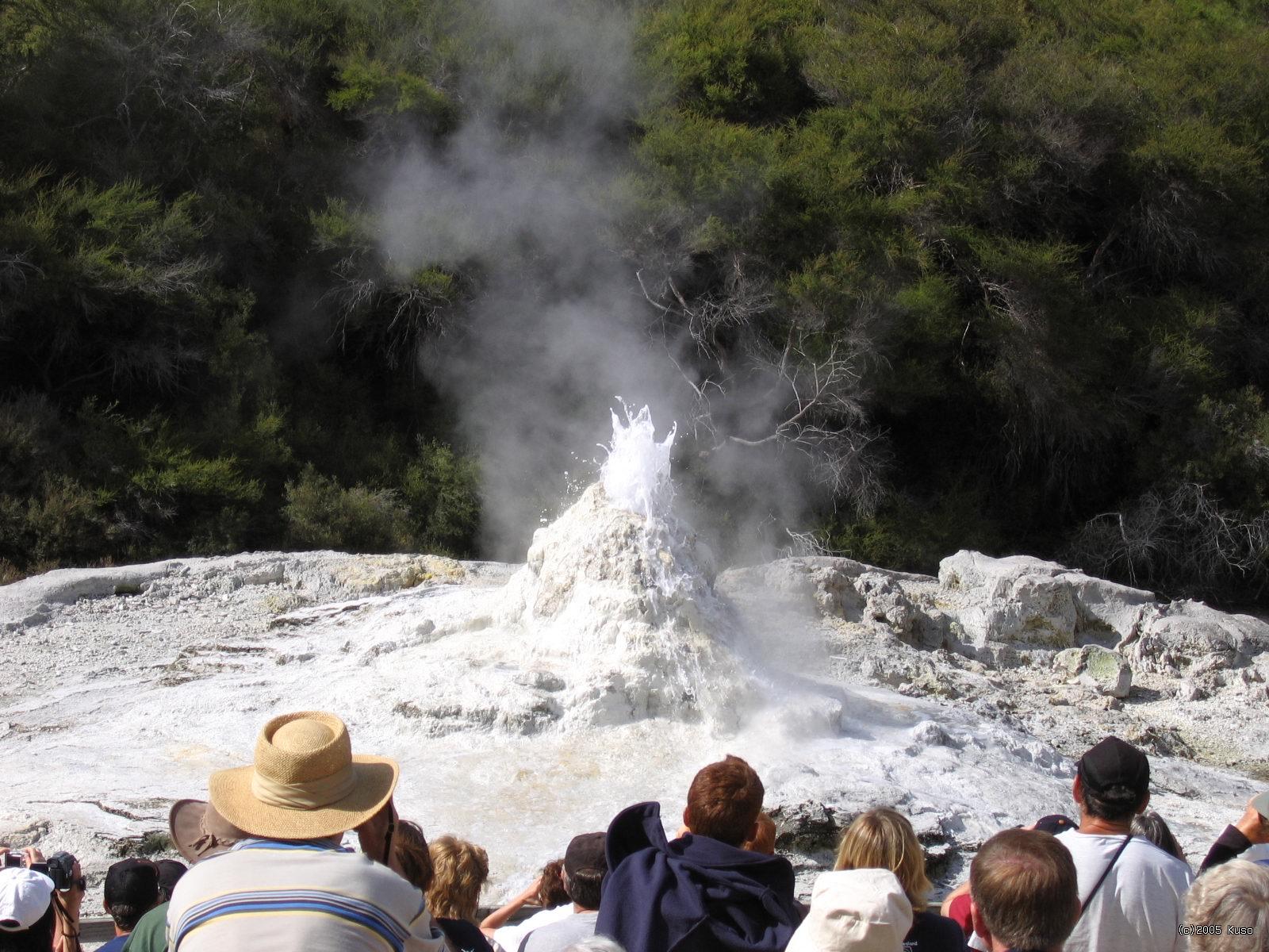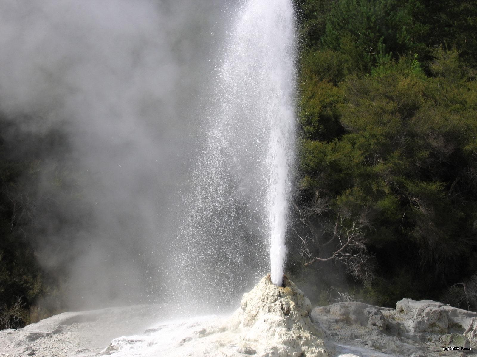 Rotorua. Najznámejšia geotermálna oblasť na Zélande. Prehliadka toho, čo dokáže geotermálna energia. Gejzíry, krátery, bublajúce bahno, para, syčanie, síra.